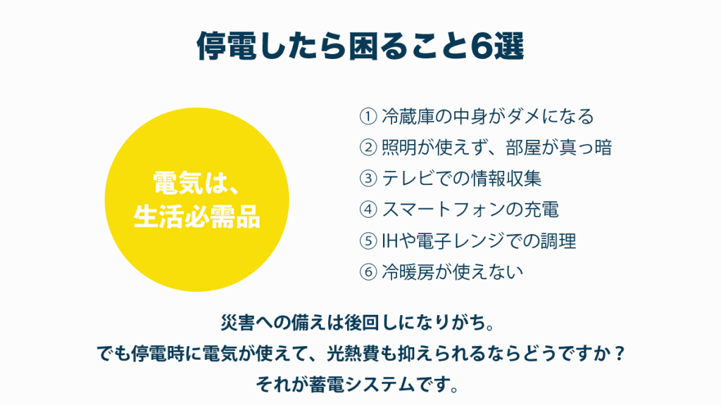 停電が長引いても、太陽光発電と組み合わせることで長時間電気を使用することができます。